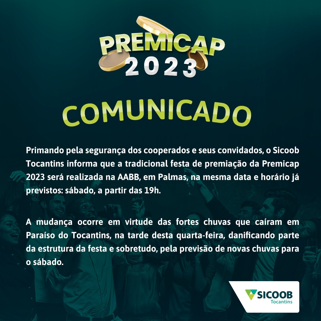 Primando pela segurança dos cooperados e seus convidados, o Sicoob Tocantins informa que a tradicional festa de premiação da Premicap 2023 será realizada na AABB, em Palmas, na mesma data e horário já previstos: sábado, a partir das 19h.
