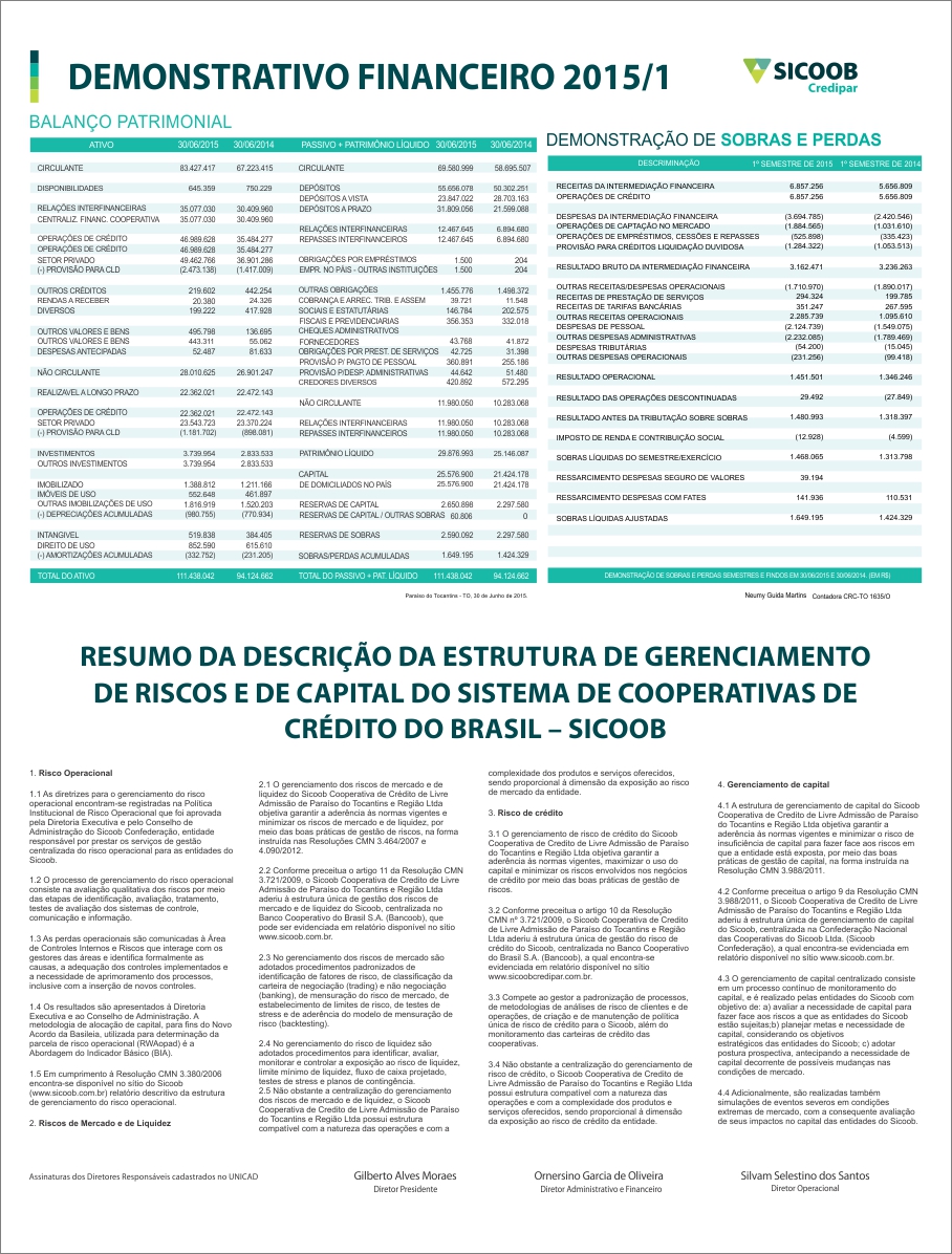 Demonstrativos 1º Semestre de 2015 - Relatórios - Sicoob Tocantins