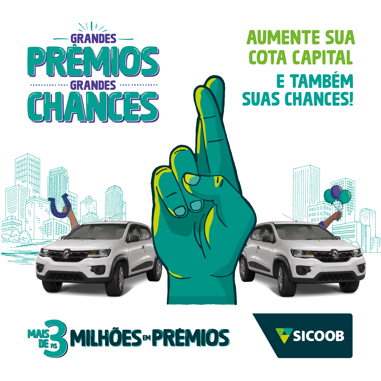 A campanha Grandes Prêmios Grandes Chances é válida até dia 31/12/2022 e sorteará R$ 500,00 a cada dois meses para os associados Sicoob Transcredi. E no final da campanha, no mês de janeiro de 2023, o sorteio será de um carro 0km – modelo Renault Kwid ZEN.