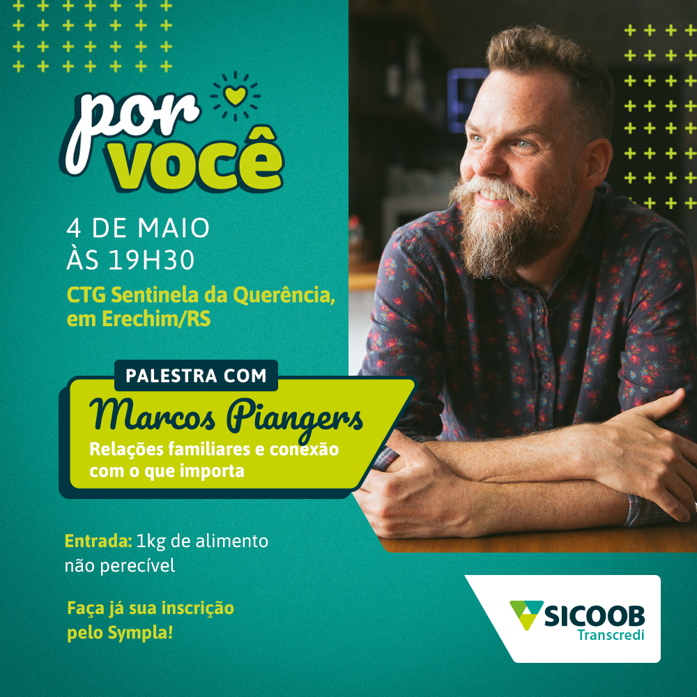 O Sicoob Transcredi traz para Erechim, Marcos Piangers através do projeto Por Você. A inciativa, que já está na quarta edição, tem o objetivo de propor ações que possam impactar positivamente a vida das pessoas. Já participaram de outras edições Dado Schneider, Thiago Concer e Arthur Igreja.