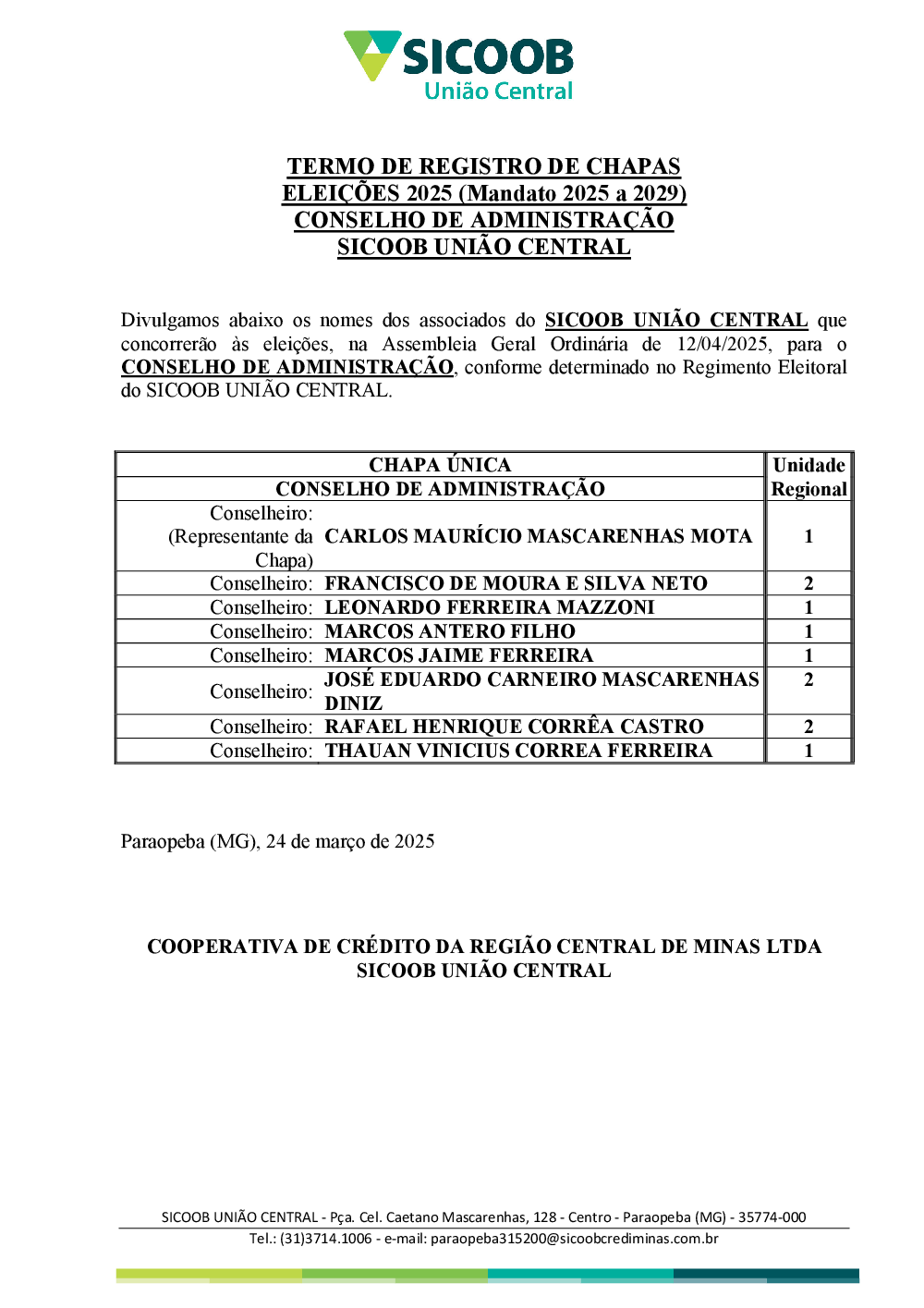 Microsoft Word - DIVULGAÇÃO DE CHAPAS - ELEIÇÕES 2025 - SICOOB UNIÃO CENTRAL - CONSELHO DE ADMINISTRAÇÃO