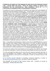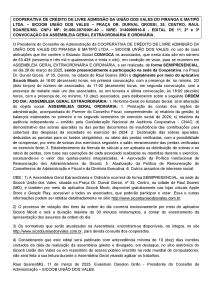 - Este edital será publicado com antecedência mínima de 10 (dez) dias corridos e divulgado com destaque no site do Sicoob União dos Vales ou em repositório público irrestrito. Não será feita sua leitura durante a Assembleia para agilizar os trabalhos.