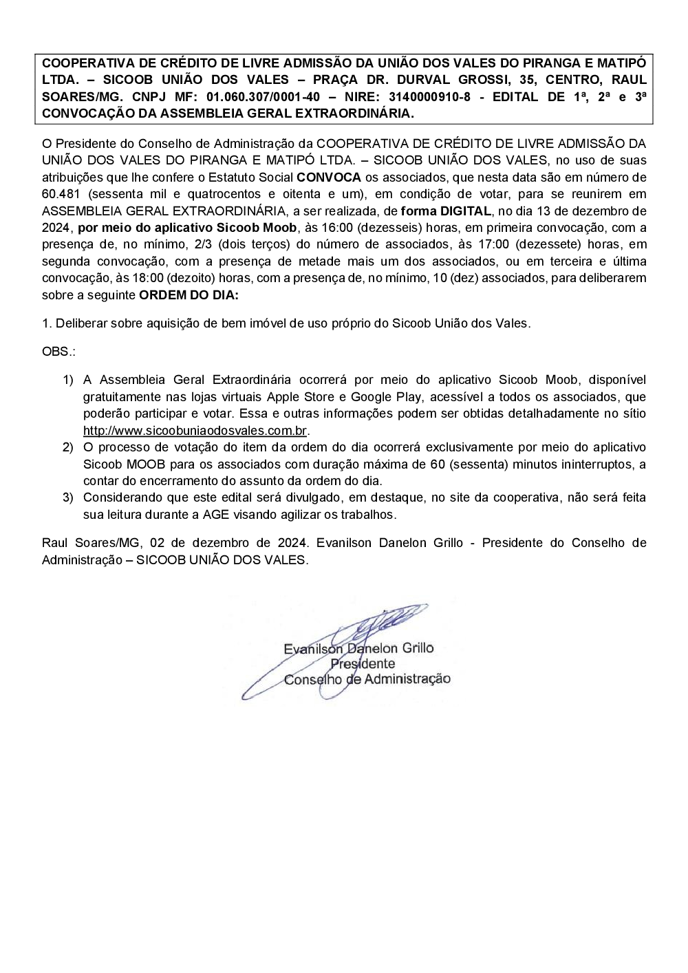 O Presidente do Conselho de Administração da COOPERATIVA DE CRÉDITO DE LIVRE ADMISSÃO DA UNIÃO DOS VALES DO PIRANGA E MATIPÓ LTDA. – SICOOB UNIÃO DOS VALES, no uso de suas atribuições que lhe confere o Estatuto Social, CONVOCA os associados, que nesta data são em número de 63.438 (sessenta e três mil e quatrocentos e trinta e oito), em condição de votar, para se reunirem em: