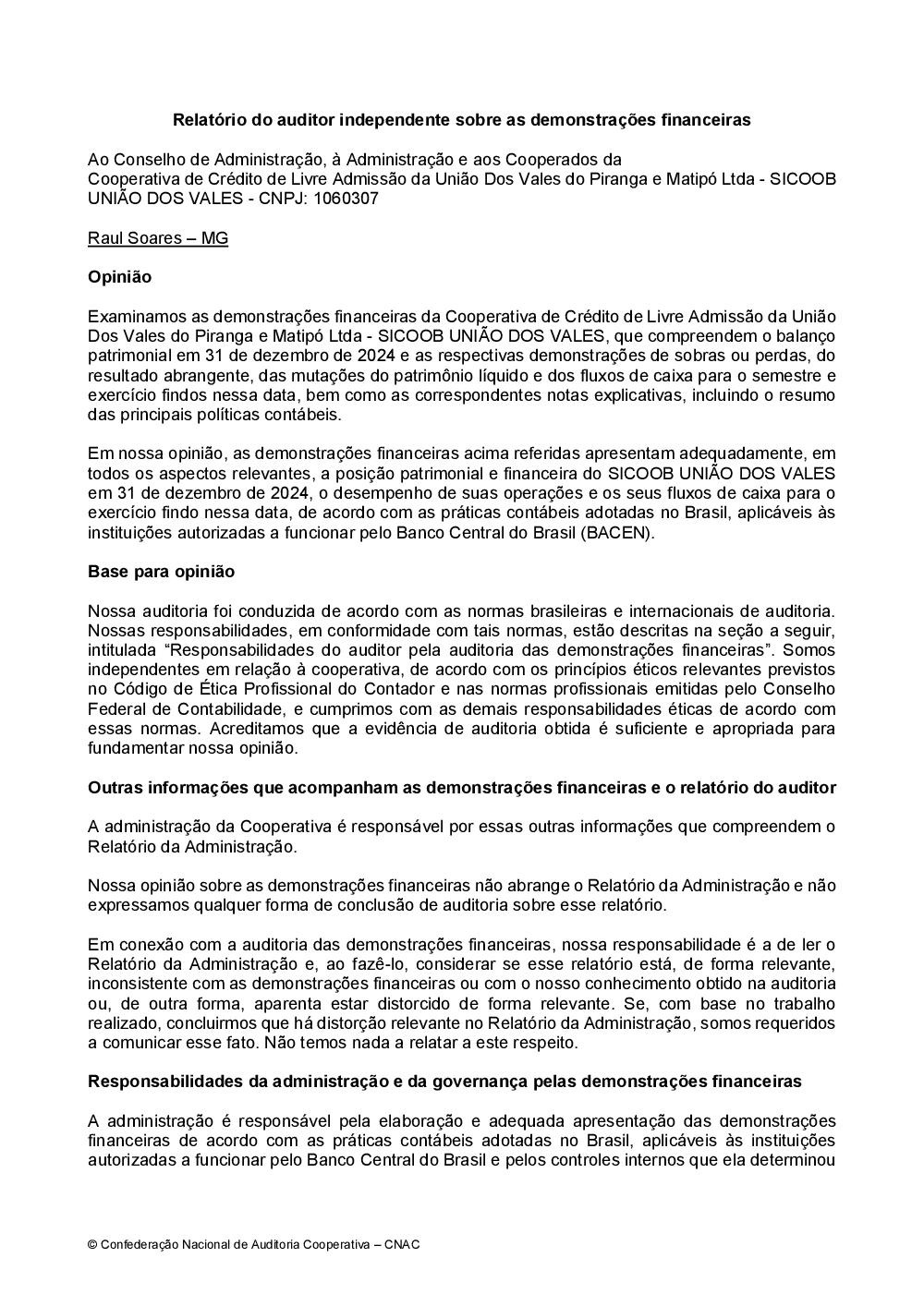 - c) Relatório da auditoria independente – Confederação Nacional de Auditoria Cooperativa – CNAC;
