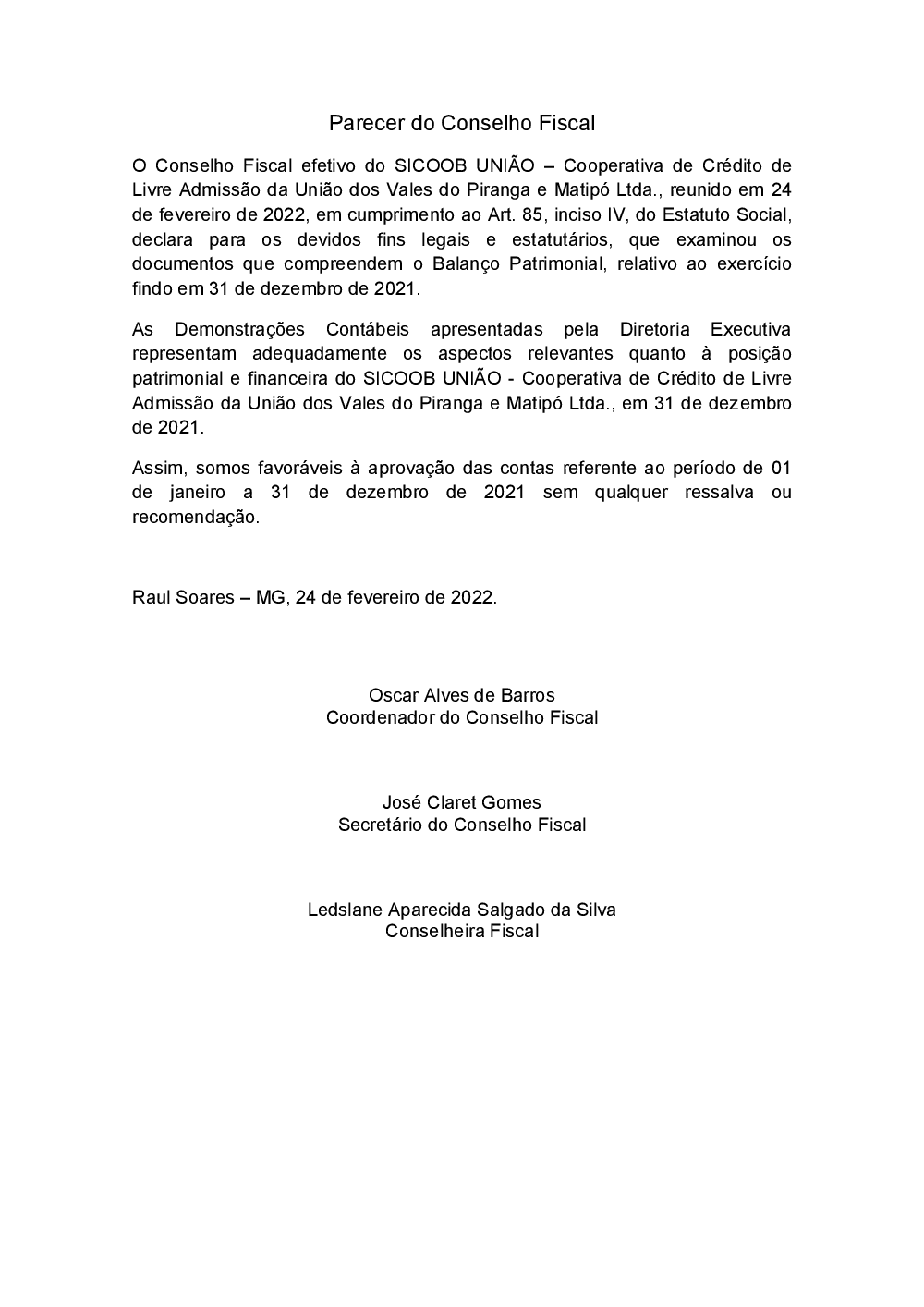 - c) Relatório da auditoria independente – Confederação Nacional de Auditoria Cooperativa – CNAC;