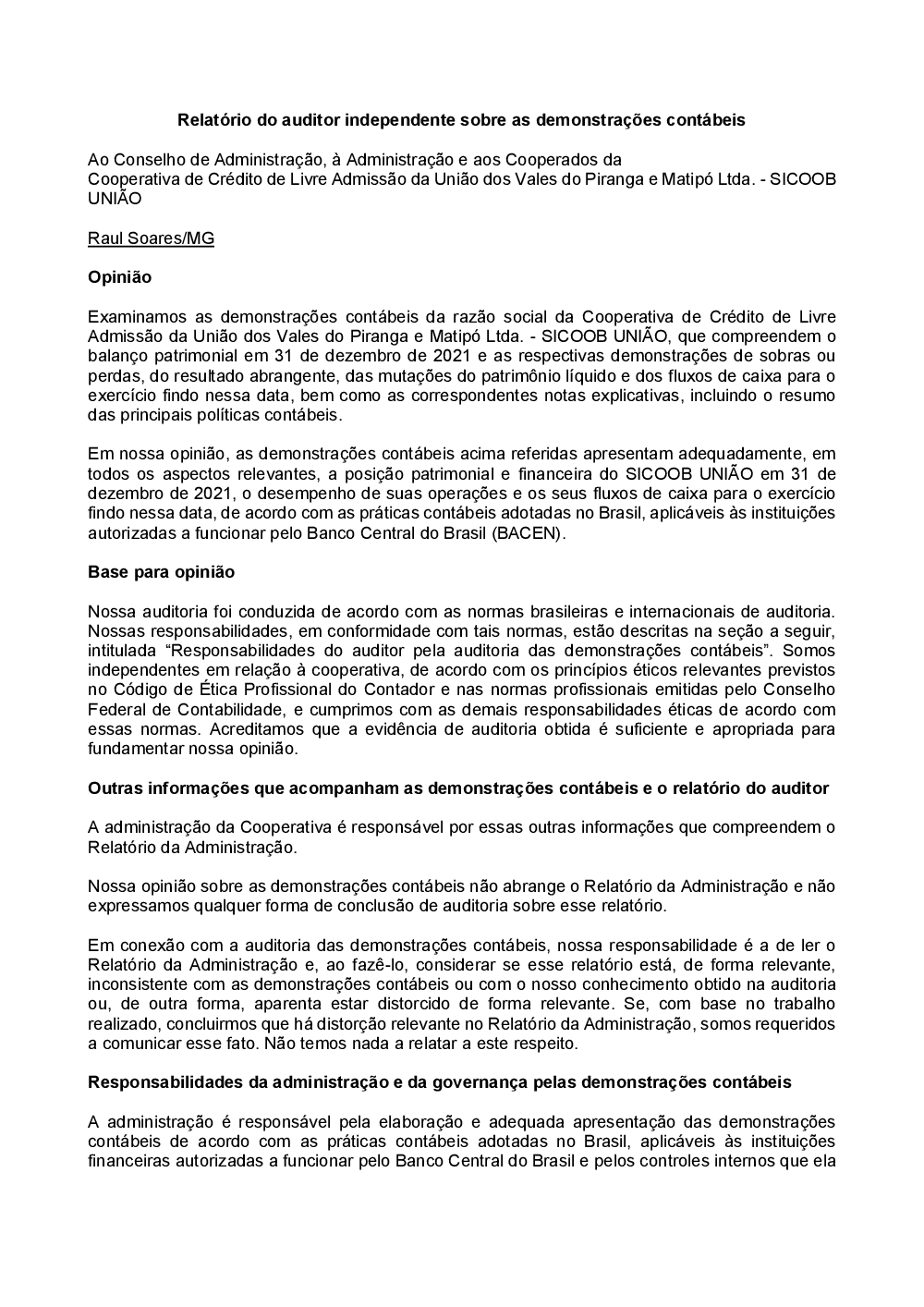 - c) Relatório da auditoria independente – Confederação Nacional de Auditoria Cooperativa – CNAC;