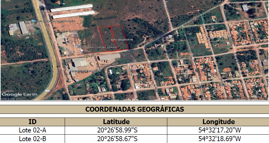 Lotes nº 02-A e 02-B, Quadra 42, localizados na Rua Maria Dimitrov, bairro Jardim Veraneio, em Campo Grande/MS. Cada lote possui 5.005 m², com 38,50 m de frente e fundo e 130,00 m nas laterais.