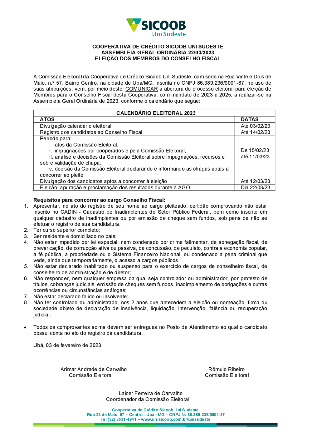 Comunicação de Processo Eleitoral - Eleição de Membros para o Conselho Fiscal - Sicoob Uni Sudeste