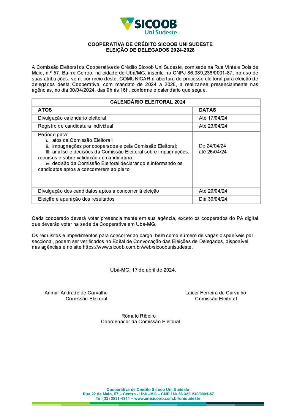 Comunicado e Calendário Eleitoral da eleição de Delegados