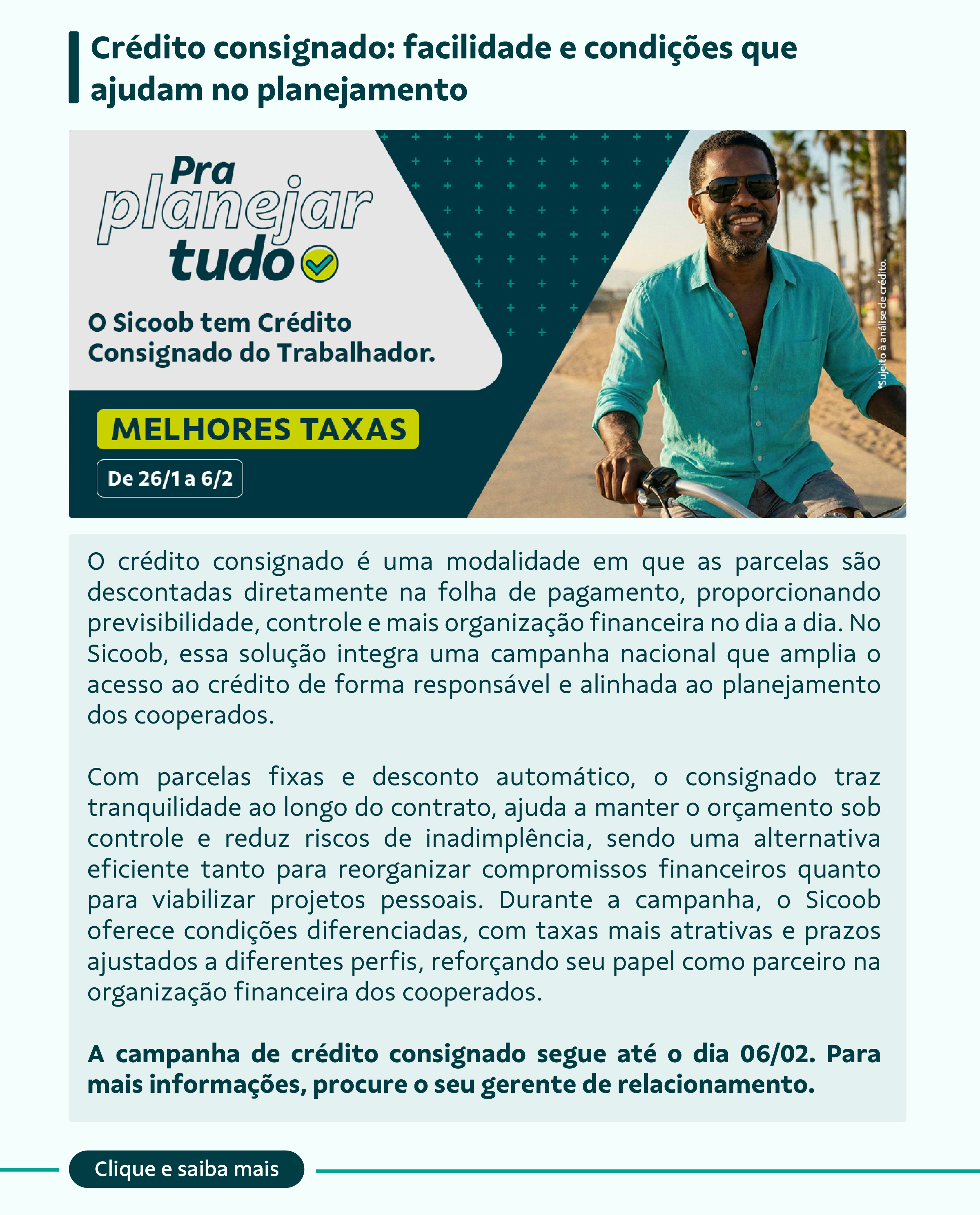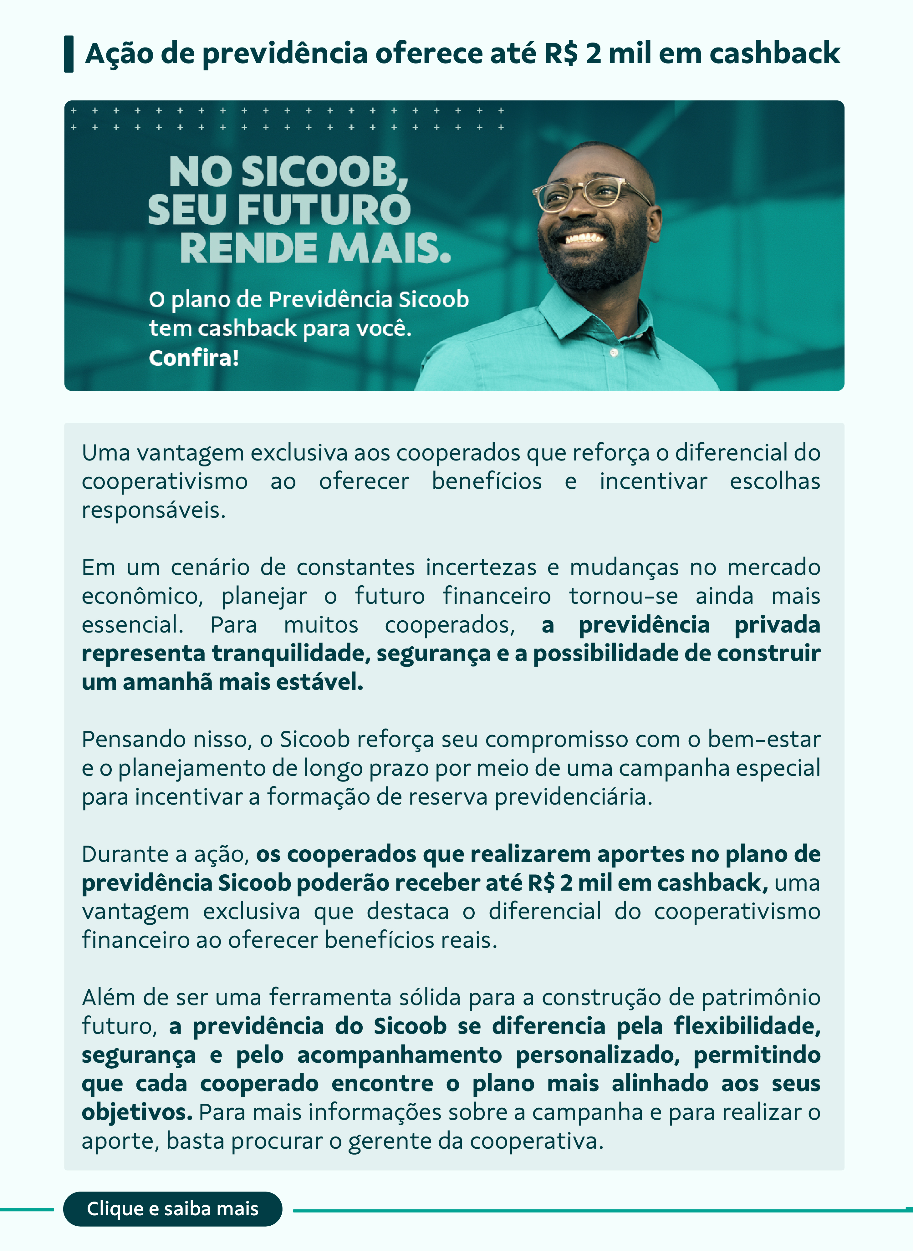 Por meio deste canal, você recebe um resumo inteligente e organizado dos principais acontecimentos do mês, reunindo em um só lugar tudo o que faz diferença para a sua jornada como cooperado.
